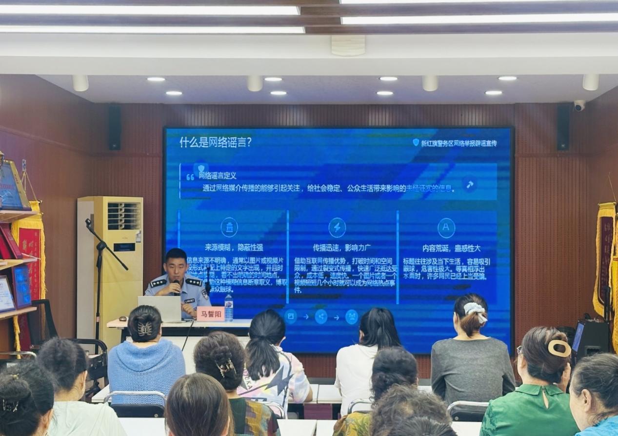 长春经开区管委会于2025年8月25日至31日开展了网络举报辟谣宣传周活动。本次活动以“网聚长春正能量 举报辟谣e路行”为主题,形式多样、内容丰富,取得了良好的社会效果。在线上充分发挥网络平台传播优势,利用“两微一端”等新媒体平台,集中发布网络举报辟谣知识、举报途径、受理处置重点领域、注意事项等。通过制作发布图文、海报等多种形式的网络作品,以通俗易懂、生动形象的方式向广大网民普及网络谣言相关知识。线下联合属地派出所、洋浦社区共同举办网络举报辟谣专题宣讲活动,向在场群众普及网络谣言的危害、识别方法以及举报途径等知识。